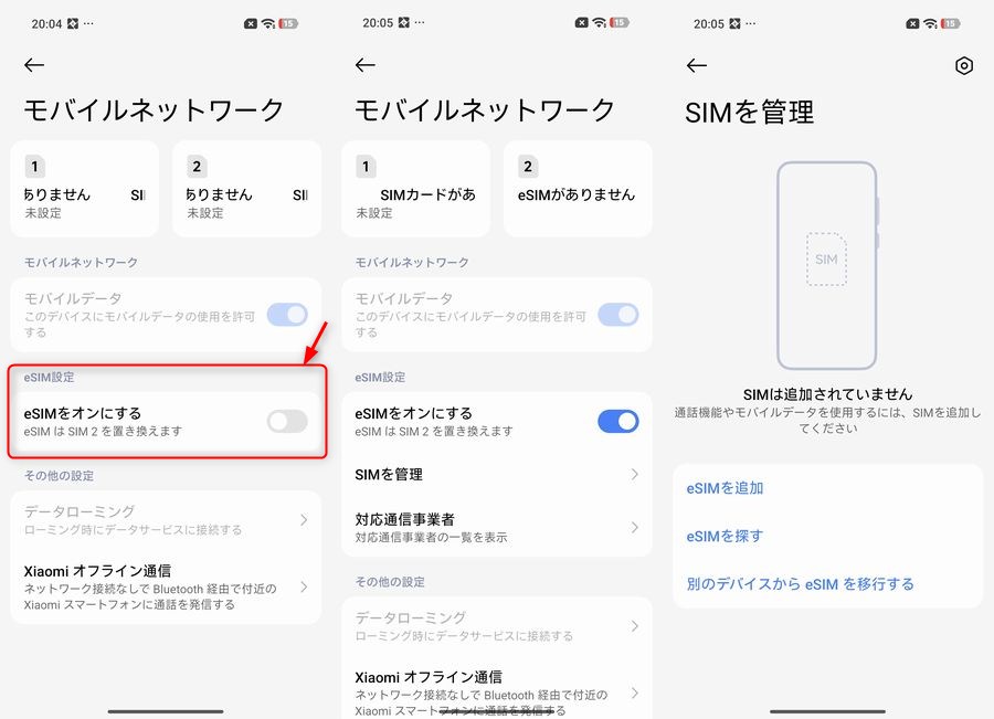 設定でeSIMを有効化すると、SIM2がeSIMに割り当てられて、2枚目の物理SIMが無効化されます。