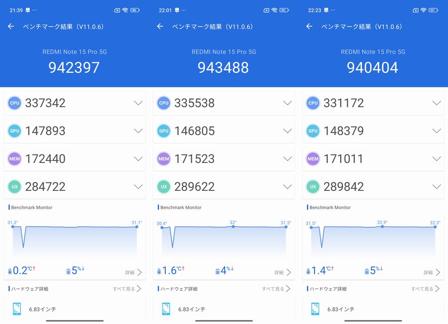 以上、Xiaomiの「REDMI Note 15 Pro 5G」実機でAnTuTuベンチマークスコアをチェックした状況について紹介しておきました。